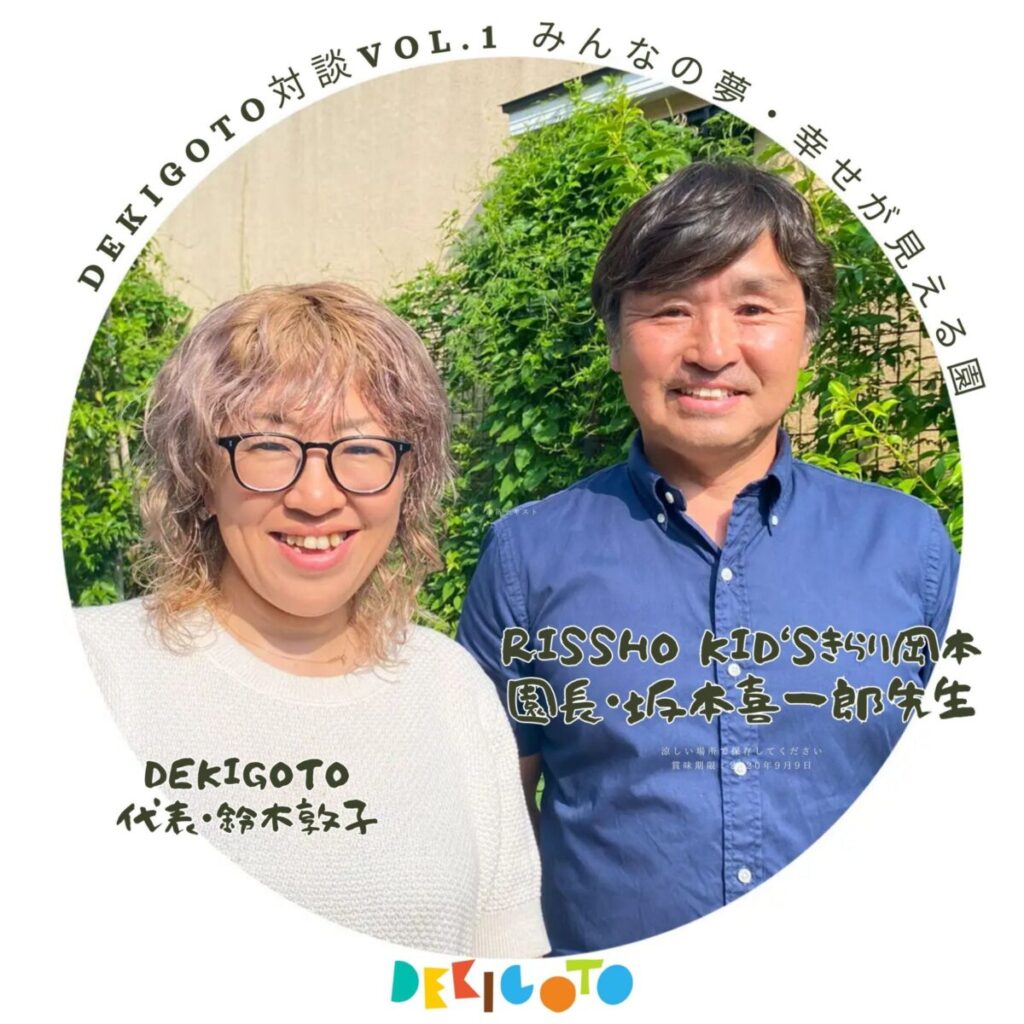 本システムのウェブサイトでは、保育関連団体の取組みを当社代表との対談記事として掲載してまいります。第一弾として、こどもたちの夢・幸せが見える園「RISSHO KID‘Sきらり岡本」園長・坂本喜一郎先生との対談記事を公開しました。