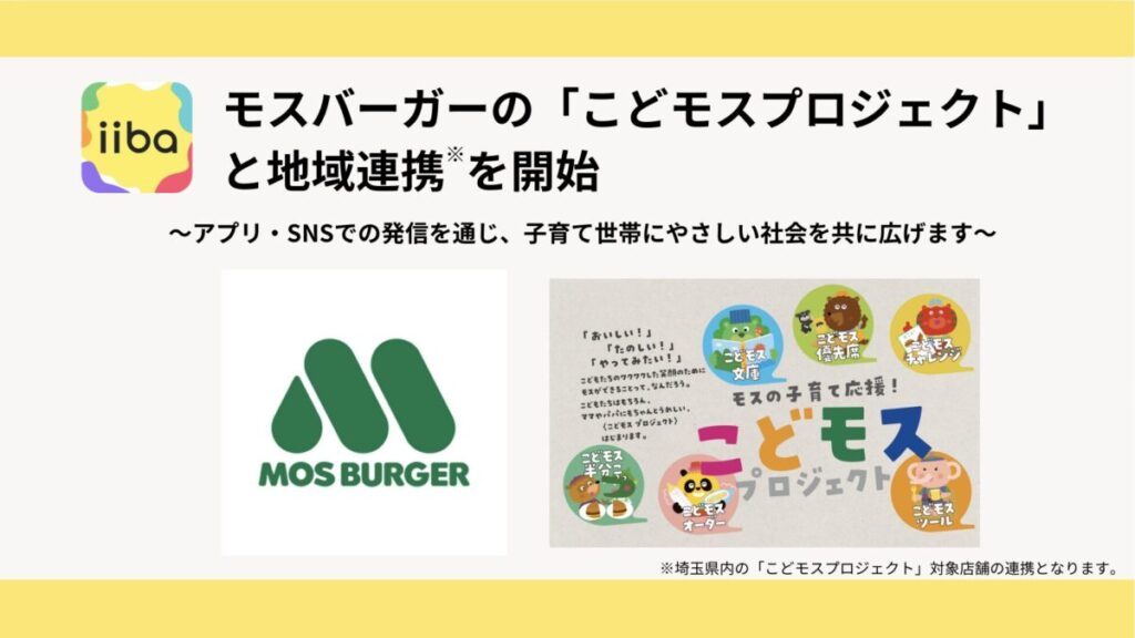 子育てマップアプリ「iiba」、モスバーガーの「こどモスプロジェクト」と地域連携を開始