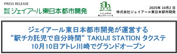株式会社ジェイアール東日本都市開発(本社:東京都渋谷区、代表取締役社長:根本 英紀、以下ジェイアール東日本都市開発)が新規事業として準備を進めてきた子育て支援・一時預かりサービスのTAKUJI STATION タクステが、10月10日(金)にJR川崎駅にあるアトレ川崎でオープンいたします。