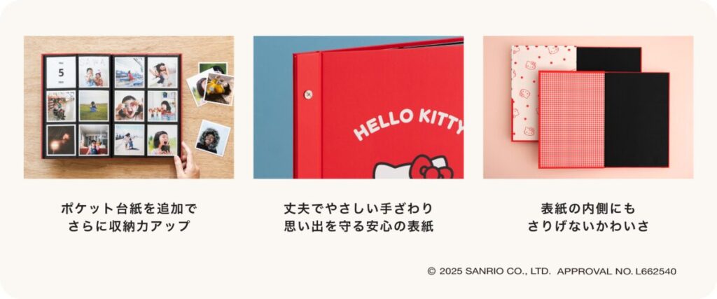 「ハローキティ」デザインの本商品は、お子さまとの毎日を「ハローキティ」と一緒に記録し、写真を収納するたびに心が「ほっこり」するような温かいデザインが特徴の写真プリント収納用アルバム商品です。また、思い出がたくさん増えた際には、「ポケット台紙」を追加することで、大切な写真をまとめてアルバムに収納し続けることが可能です。