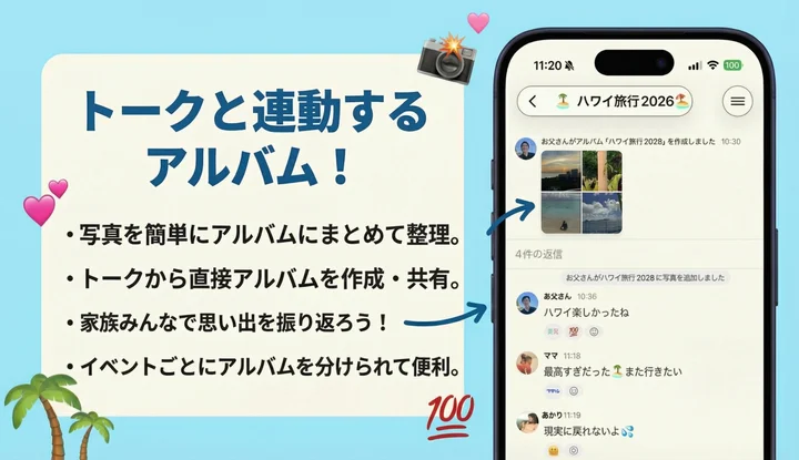 各トークルームにアルバムを紐づけることができるため、旅行、学校行事、ペットの成長など、テーマ別に写真を体系的に保存できます。写真やアルバムにコメントをすると自動でスレッド化され、将来見返したときも、当時の会話とともに思い出を振り返ることができます。