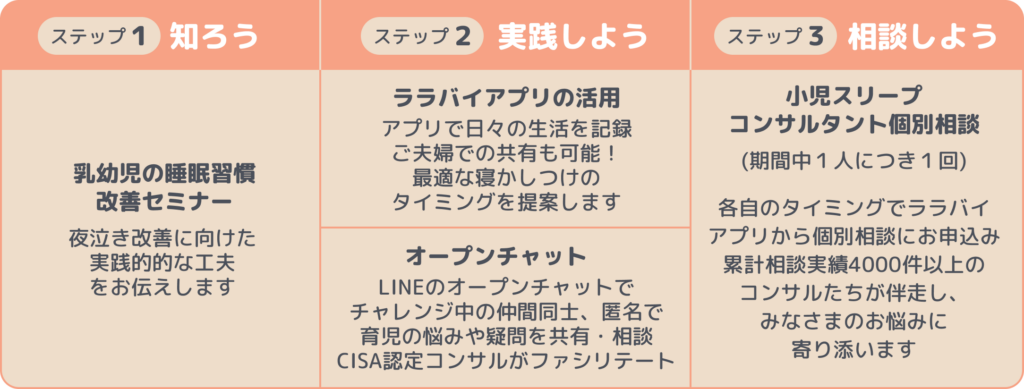 - 伴走型サポート:CISA認定小児スリープコンサルタントが、個別の悩みに寄り添って伴走サポート