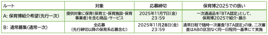 BabyTech® Awards 2025-26では、すべてのご応募商品・サービスを公正に審査いたしますが、保育事業者向け商品・サービスについては、2025年11月開催の「保育博2025」との連携により、一次審査のスケジュールを一部前倒しして実施いたします。