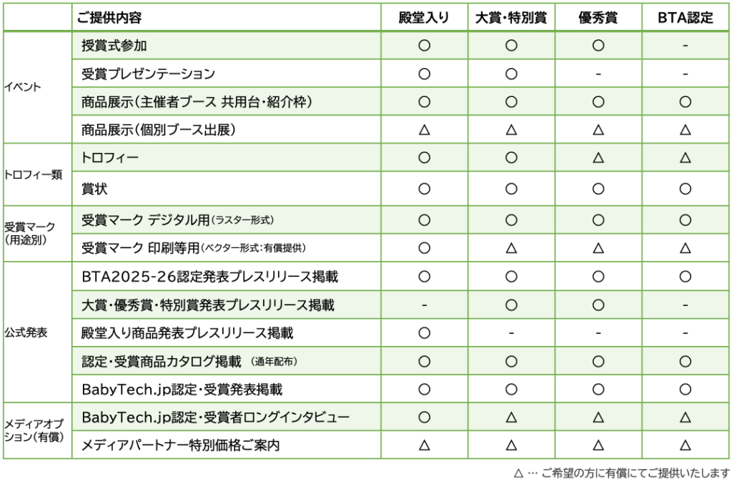 BabyTech® Awards では、複数の認定・受賞があり、それぞれに応じた特典を受けられます。