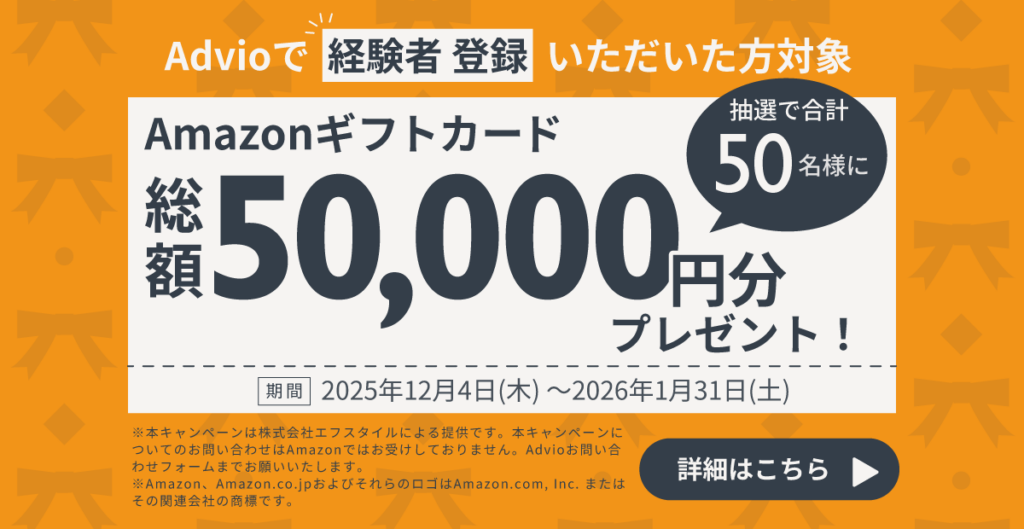 リリースを記念し、2025年12月4日から2026年1月31日までの期間中、Advioで経験者登録をされた方、または相談サービスをご利用いただいた方の中から抽選で、Amazonギフト券をプレゼントいたします。キャンペーンの詳細は、Official Siteにてご確認いただけます。