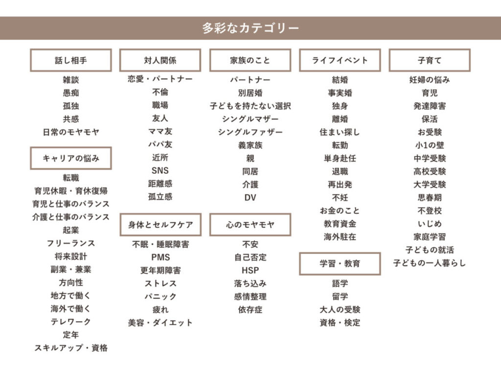 本サービスは、職場・家庭・SNSなど、既存の相談手段では話しづらいテーマについて、匿名で安心して相談できるオンラインプラットフォームです。