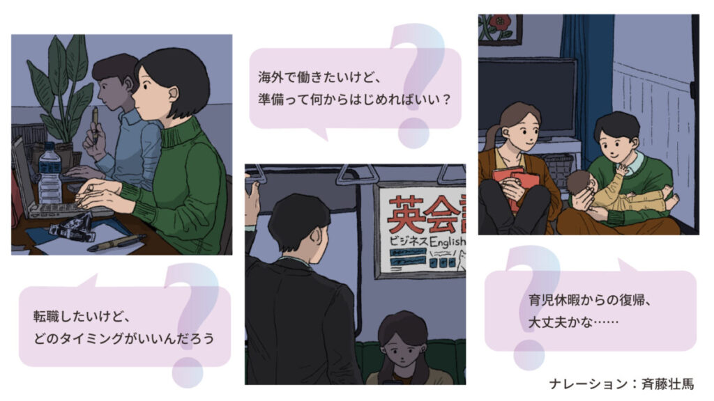 「キャリア不安」や「育休復帰」「地方・海外で働く」「介護」など、働く中で直面する悩みは多岐にわたります。しかし、職場や家庭、身近な人間関係では本音を話しづらいという課題を抱える方は少なくありません。一方で、インターネットやSNS上の情報は、信頼性が不十分であったり、心ない言葉に傷ついてしまうケースもあります。
