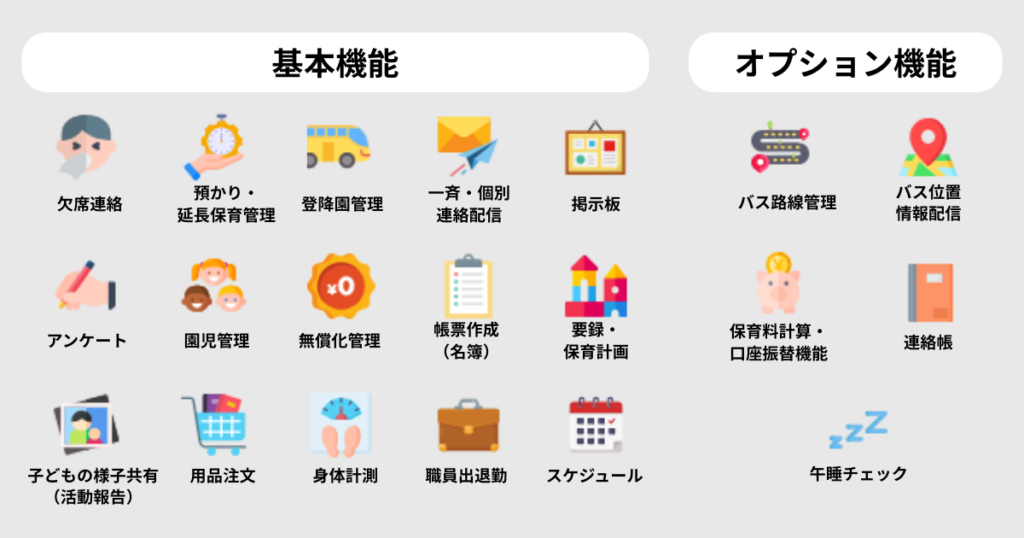 幼稚園・保育園・認定こども園など幅広い施設に対応し、欠席・遅刻連絡、園バス運行管理、登降園・預かり保育管理、用品販売、キャッシュレス対応など日々の業務をデジタル化。