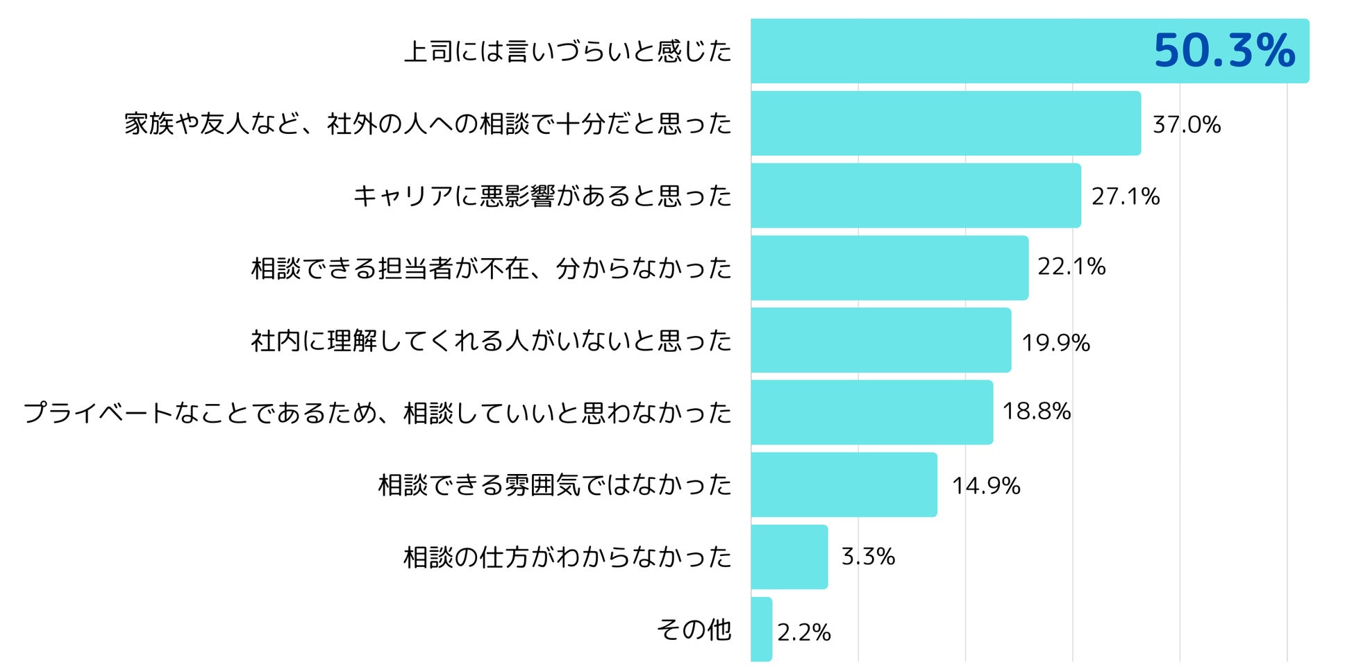 相談できなかった理由として過半数が挙げたのが「上司には言いづらいと感じた(50.3%)」でした。さらに、「家族や友人など、社外の人への相談で十分だと思った(37.0%)」、「キャリアに悪影響があると思った(27.1%)」、「相談できる担当者が不在、分からなかった(22.1%)」という回答も続きます。心理的な壁と相談環境の整備が課題であることが分かりました。